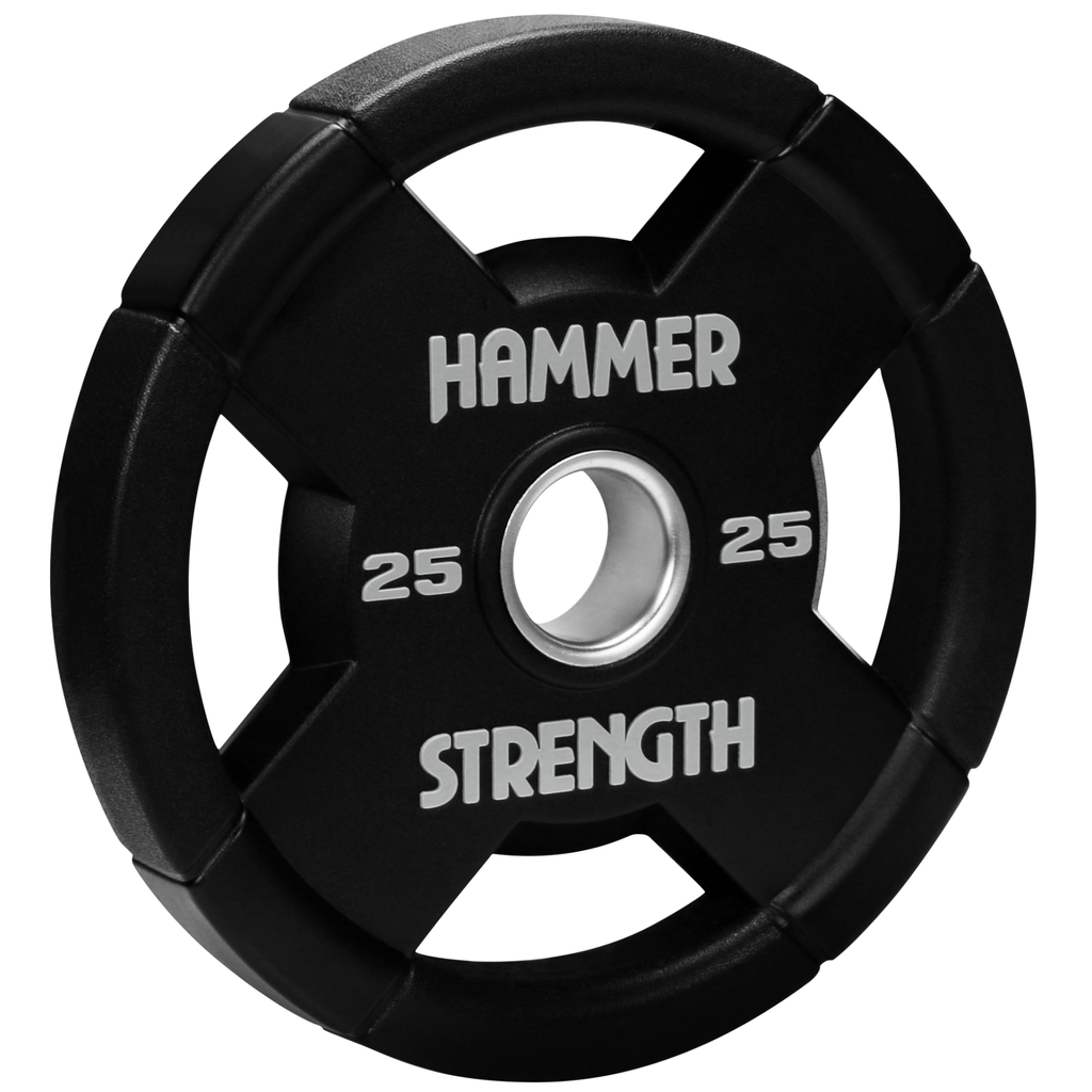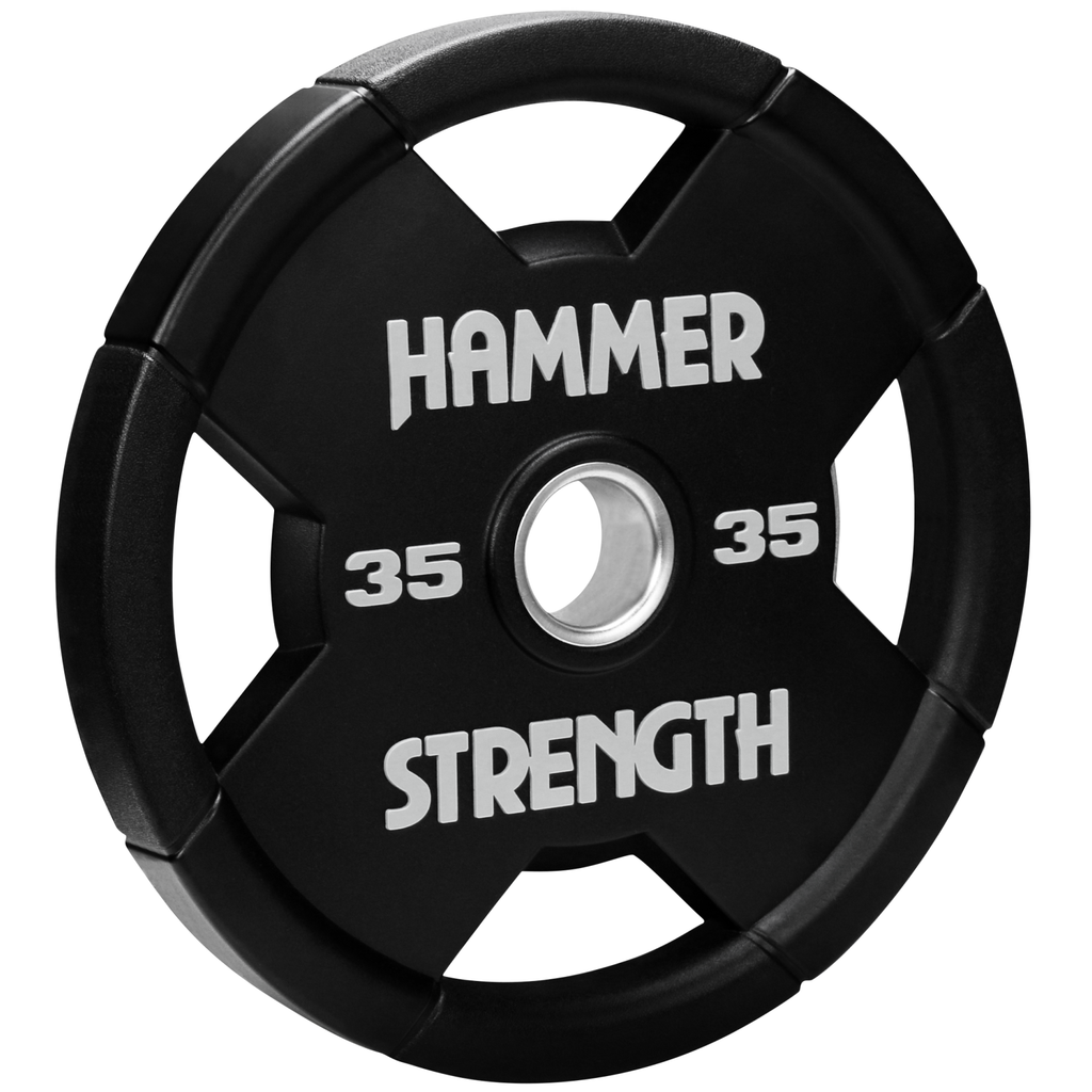 These round urethane Olympic plates are designed with bright white weight numbers to make identification easy. Each plate has four handles for easy pickup, storage and loading when you are finished with your workout. A stainless steel ring in the center of the plate ensures greater durability.